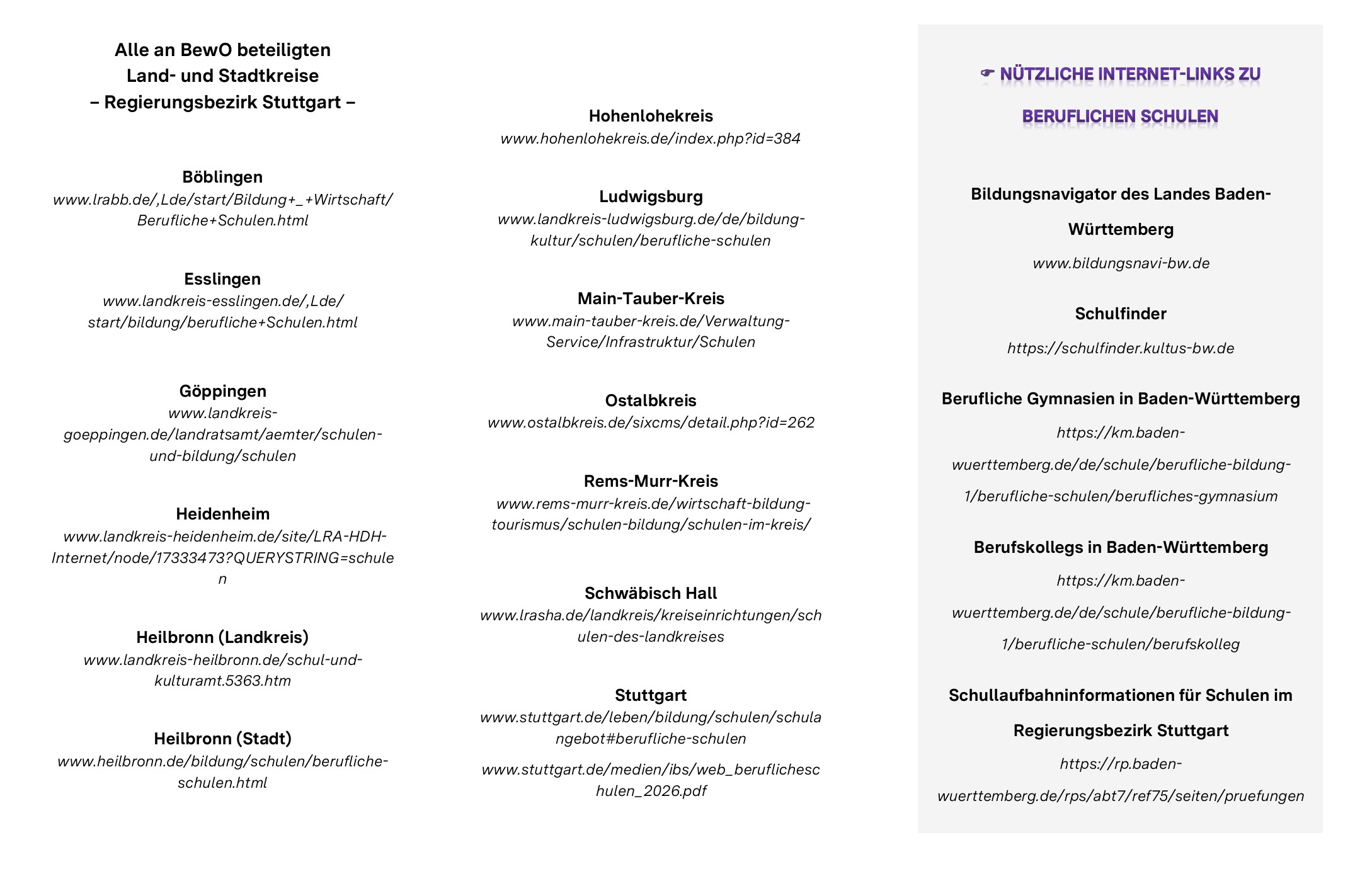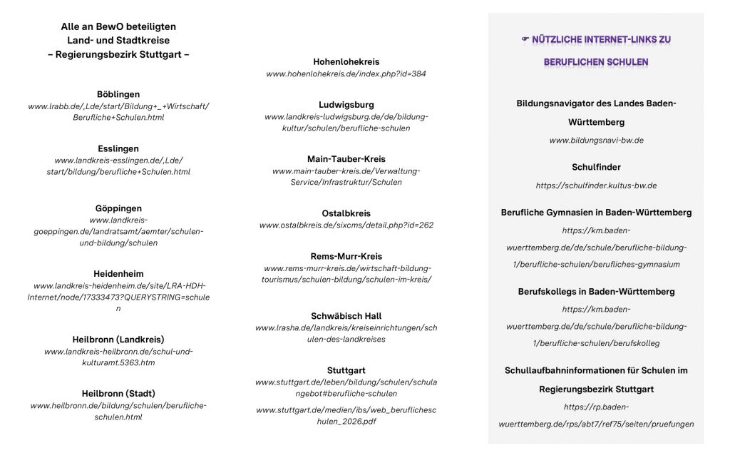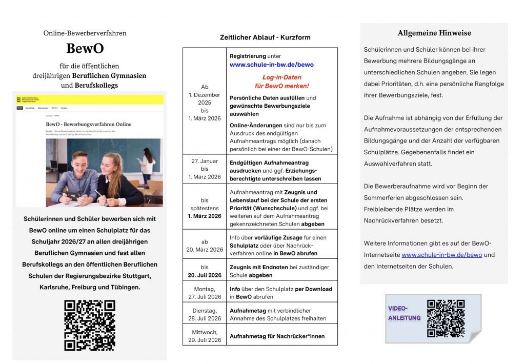 Schülerinnen und Schüler bewerben sich mit BewO online um einen Schulplatz für das Schuljahr 2025/26 an allen dreijährigen Beruflichen Gymnasien (BG) und fast allen Berufskollegs (BK) an den öffentlichen Schulen der Regierungsbezirke Stuttgart, Karlsruhe, Freiburg und Tübingen.